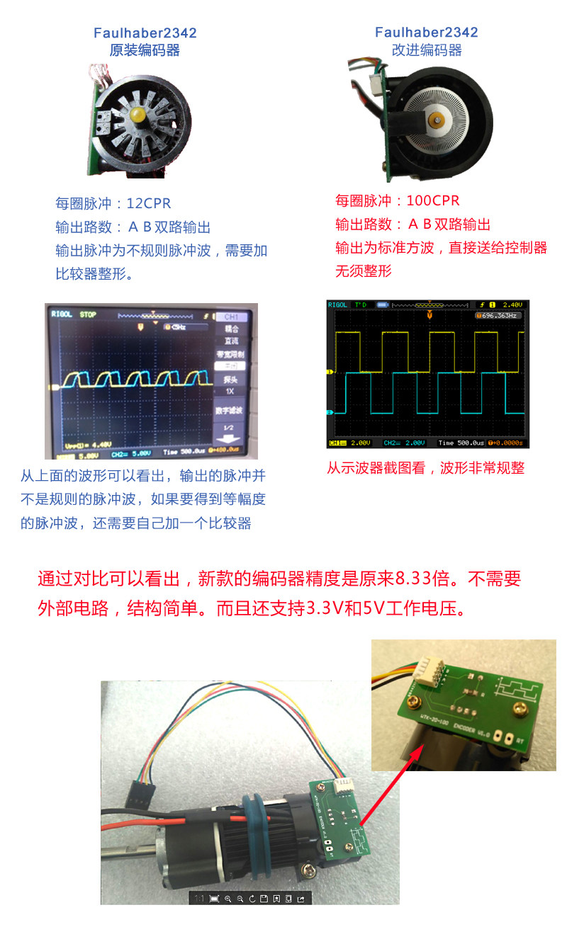 我们在德国冯哈勃Faulhaber基础上,升级了码盘和测速编码器。将原电机带的12CPR码盘升级到100CPR。同时升级了光电编码器,WTK-20直接输出标准方波,无需外部电路整形,直接送给单片机。